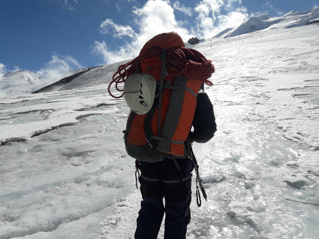 The final summit day is a tough grind up the glacier. We followed by a short sharp scramble up an ice wall using crampons and ice axes. Our Sherpa guide will put in a fixed rope for your safety so it would be safe.